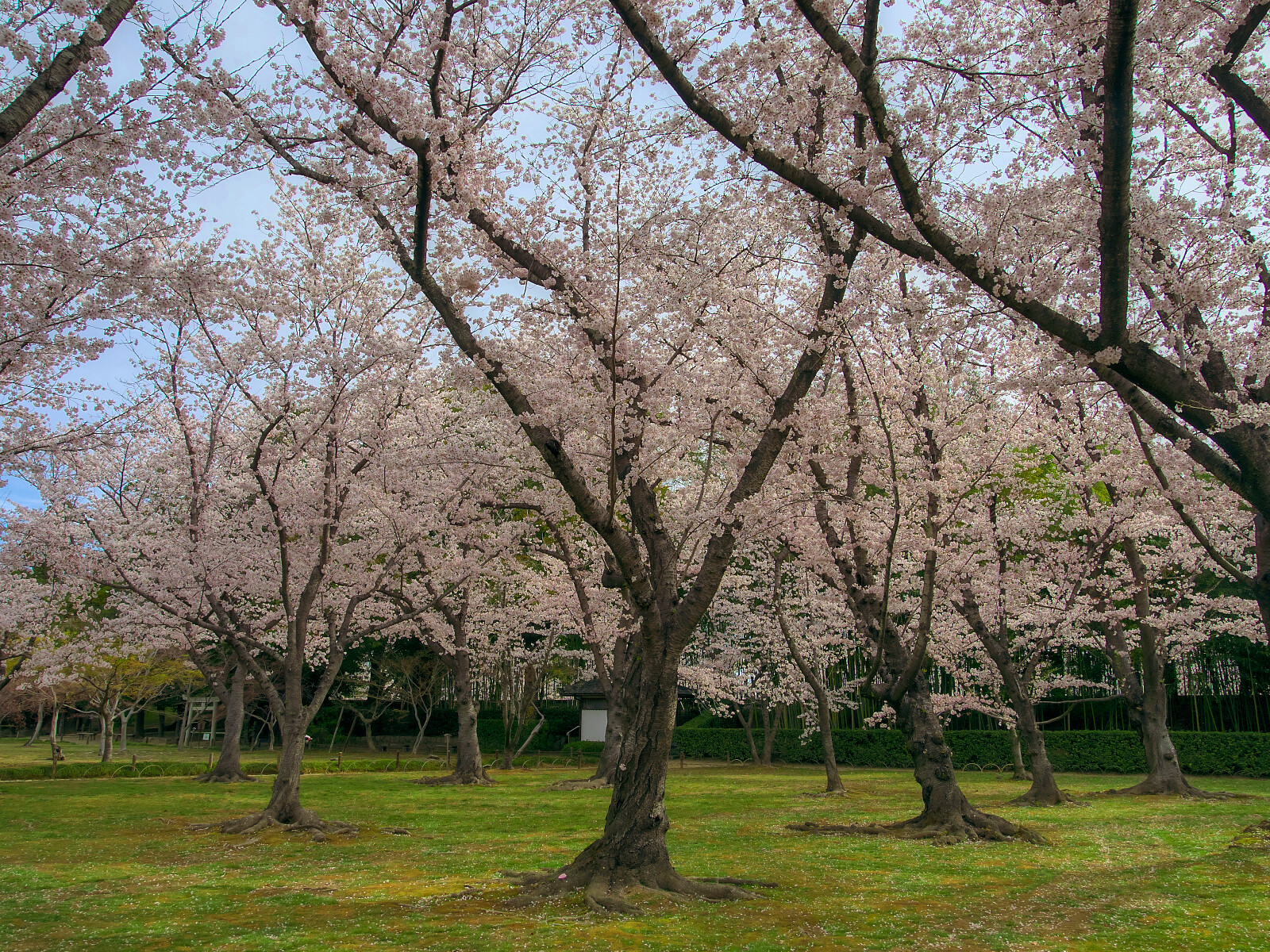 また、南門の桜は大きな滝のように連なり、新緑の芝との景色が圧巻