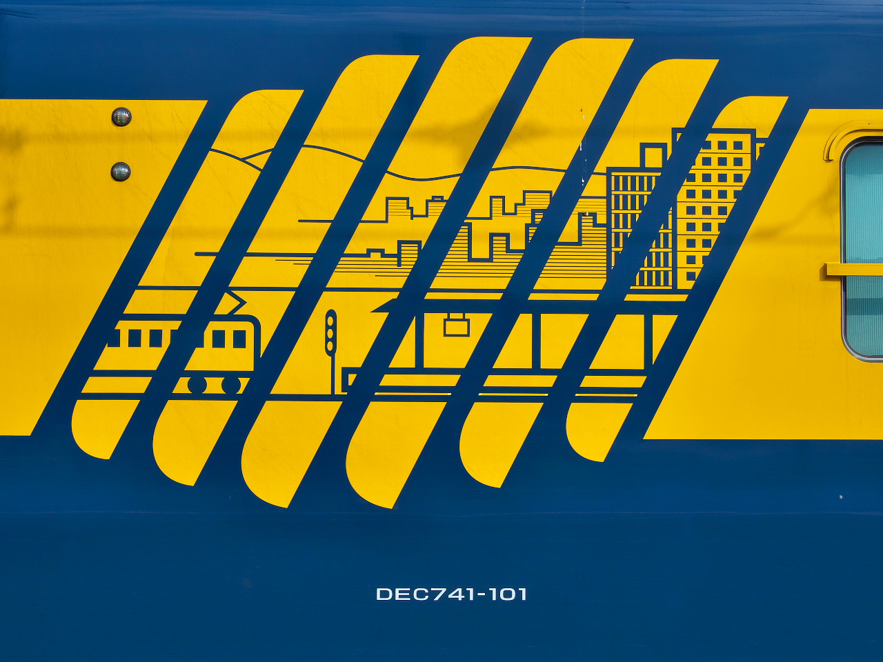 架線検測装置などを搭載するトレーラー車の DEC741-101 の2両編成 外観デザインは、警戒色で検測車のイメージでもある黄色と、クモヤ143系 のような 事業用車に使われる青色の2色 この2色による 映え も意識したデザインとの事だが? DEC741-101 の側面には、この車両のコンセプト 鉄道の安全を守ること や DEC741が走る風景 といったことを示すロゴがデザインされています