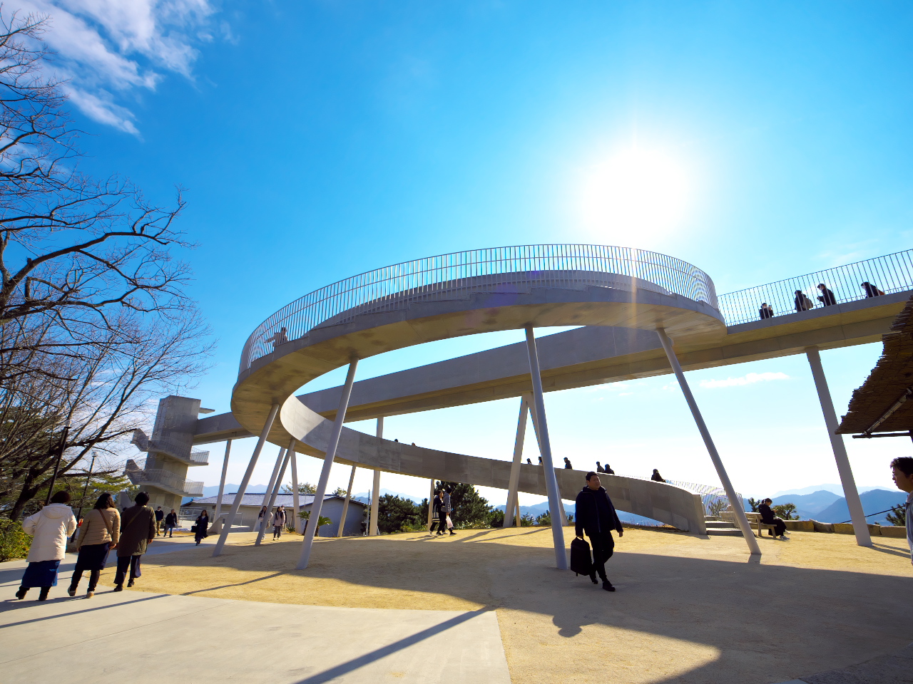 ベビーカーや車いすの方も安心してご利用いただけます 設計テーマは 尾道市の景観に調和したシンボル空間の形成 山々のスカイラインを守るため細く軽い構造体でつくられた橋梁型 どこからでも瀬戸内の島々の眺望を楽しめる細長い展望台です